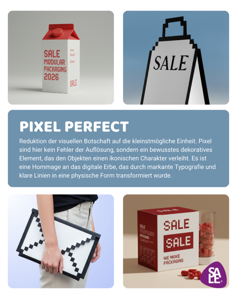 Pixel-Perfect-Merkmale: geometrische Elemente, digitale Referenzen, reduzierte Farbigkeit und eine starke grafische Struktur.
